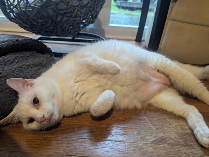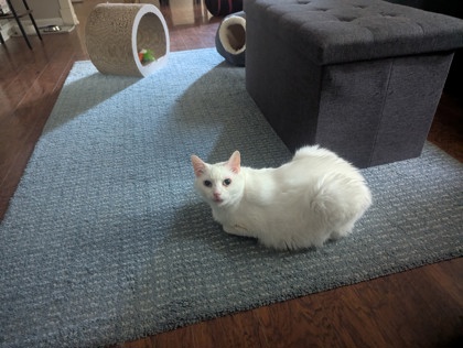 Good evening: I'm BooBoo Kitty. I'm a soft white beauty with dreamy blue eyes and a gentle heart. I've been having a tough time with shelter life, so now I'm staying with a foster family who's helping me feel safe and loved again. I'm very sweet once I start to feel comfortable, and I know that with the right person, I'll blossom into the loving companion I was always meant to be.