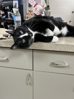 Hey hey, friend. I'm Hoffman, a three year old black and white boy with a lot to say and a whole lot of love to give. I am very talkative and I stick to my people like glue, always rubbing against legs and asking for more attention. I love singing along to my favorite songs, especially hard rock, and my favorite band in the entire world is Turnstile. Right now I am obsessed with finding the coolest rock versions of classic Christmas songs, and I am always ready to perform a duet.