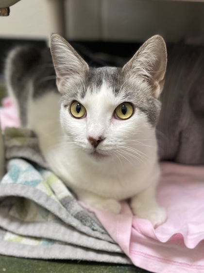 Hi there, I'm Zia, a six month old silver and white girl with a very gentle heart. I love Churru, soft petting, and quiet cozy moments. I am a peaceful kitten who enjoys tiny tea parties where I can sit warm and snug while thinking about the simple joys of life.